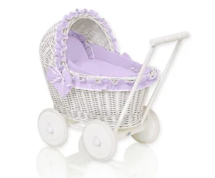 Wózek wyposażono w miękką wyściółkę oraz komplet pościeli – poduszkę i kołderkę z uroczą falbanką i lamówką. Całość dopełniają ozdobne kokardki po bokach oraz delikatna falbanka wokół budki, które nadają wózeczkowi bajkowy wygląd.