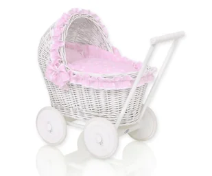 Wózek wyposażono w miękką wyściółkę oraz komplet pościeli – poduszkę i kołderkę z uroczą falbanką i lamówką. Całość dopełniają ozdobne kokardki po bokach oraz delikatna falbanka wokół budki, które nadają wózeczkowi bajkowy wygląd.