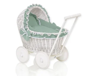 Wiklinowy wózek dla lalek pchacz biały z szałwiową pościelką i miękką wyści