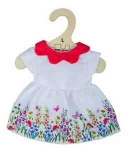 Wymiary: 20x27x1 cm Wiek: 2+ Materiał: tkaninaBiała sukienka w kwiaty z czerwonym kołnierzykiem. Sukienka może być noszona na lalkach o rozmiarze 38 cm. W zestawie znajduje się również wieszak.