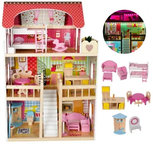 3; ilość pokoi: 5 + balkon W ZESTAWIE konik na biegunach toaletka łóżko piętrowe stolik + 2 krzesła stolik fotel sofa meblościanka kuchenna umywalka z lustrem prysznic toaleta lampa kwiatek domek Wysoka jakość wykonania Zestaw jest wykonany z wysokiej jakości materiałów, a cechuje go piękna i atrakcyjna kolorystyka oraz duża dbałością o każdy detal. Doskonały wybór dla Twojego dziecka! IDEALNY NA PREZENT Domek dla lalek z drewna to wspaniały pomysł na prezent, który wywoła szeroki uśmiech na twarzy Twojej córeczki! To zabawka, która pobudza wyobraźnię i kreatywność. Dziewczynki pokochają możliwość przemeblowywania i nieskończone możliwości ciekawej zabawy według różnych scenariusz i historii.