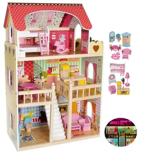 Możesz np. w całym domku, od samej góry aż do parteru. PRZESTRONNY - drewniany domek przeznaczony jest dla 4 osobowej rodziny lalek. Posiada 3 poziomy, które połączone są ze sobą pięknymi, białymi schodami, posiada aż 5 pomieszczeń i balkon. Każda lala marzy o takim dużym domku! PIĘKNE KOLORY - piękne kolory zachęcają do zabawy i pobudzają wyobraźnię dziecka. Są delikatne i niekrzykliwe, dzięki czemu nawet kilkugodzinna zabawa lalkami nie męczy oczu dziecka.