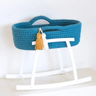 Kołyska dla lalki- Kosz Mojżesza (TURKUSOWY z materacem, zestawem pościeli, frędzlami + bujak drewniany BIAŁY