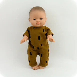 Bawełniany kombinezon uszyty z bawełny, o wzorze czarne plamki na brązowym tle. Uszyty specjalnie dla lalek Paola Reina bobas. Wysokość lalki 34 cm. Polecany...