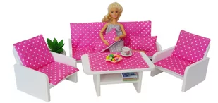 Mebelki drewniane dla lalek - zestaw wypoczynkowy do dużego domku Zestaw zawiera 10 el. sofa + 2 fotele + ława + zestaw tapicerek na sofę i fotele +bieżnik na ławę +2 poduszki Mebelki wykonane są z drewna sosnowego . Kolor mebelków ; biały WYMIARY POKAZANE NA ZDJĘCIU Mebelki pasują dla lalek do 33 cm Model : FUKSJA Produkt POLSKI - Producent PINO Kolekcja FUKSJA w soczystych barwach różu stworzona z myślą o dziewczynkach które szaleją za odważnymi kolorami różowymi w salonie domku dla lalek. Delikatne białe kropeczki dodają mebelkom delikatności i subtelności.