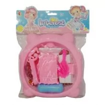 Zestaw kolorowych mebelków dla lalek jak m.in.: szafa, łóżko, sofa, szafki nocne. Wszystkie elementy zapakowane są w plastikowy koszyczek. W zestawie także naklejki.