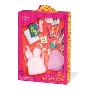 Wyjątkowe akcesoria dla lalki Bright and Learning lalka idzie do szkoły od marki Our Generation. To świetny zestaw dla każdej dziewczynki, który z pewnością zapewni fantastyczną zabawę połączoną z pożyteczną nauką i rozwojem. Nadaje się doskonale do zabawy w odgrywanie ról, którą wszystkie dzieci uwielbiają. Our Generation akcesoria dla lalki idealnie pasuje do lalek o wielkości 46 cm tej samej marki. W zestawie znajdują się akcesoria, które są niezbędne każdej lalce wybierającej się do szkoły.
