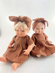 Muślinowa sukienka uszyta specjalnie dla hiszpańskich lalek Miniland. Pasują również na Lalki Minikane i lalki Paola Reina Wysokość lalki 38 cm lub 34cm. Sukienka uszyta w mięciutkiego muślinu w kolorze cynamonu, zapinana z tyłu na rzep. Sposób zapinania polecany dla najmłodszych dzieci. Do sukienki można dokupić muślinową opaskę.