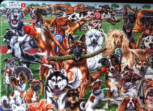 Prawie wszystkie psy wyglądają na szczęśliwe, tylko niektóre szczeniaki na dole wydają się być nieco smutne. Ta układanka jest odpowiednia dla mniejszych dzieci, ale miłośnicy psów w każdym wieku będą chcieli przestudiować niesamowitą ilustrację ze wszystkimi pięknymi psami. Firma Larsen od 75 lat tworzy wysokiej jakości układanki z grubej (4mm) tektury. Naszą ideą zawsze było tworzenie wysokiej jakości produktów dla dzieci, które są zarówno zabawne, jak i edukacyjne. Znajdujemy się w Flekkefjord, idyllicznym miasteczku w południowej Norwegii, w połowie drogi między Kristiansand i Stavanger.