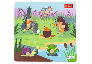 Układanka drewniana Zwierzątka na łące Puzzle drewniane z kolorową grafiką Podstawka z wyżłobieniami oraz 5 wyjmowanych elementów z drewnianym knobem Zadaniem dziecka jest dopasowanie puzzli w odpowiednie miejsce na podstawce - zadanie ułatwi grafika znajdująca się na wyżłobieniach -. . .