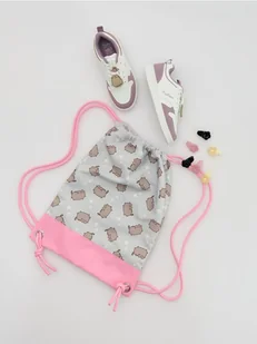 Plecak typu worek, wykonany z wzorzystej tkaniny.