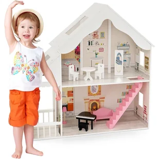 Ten dwupiętrowy domek dla lalek ma 5 pokoi wewnętrznych, zewnętrzną werandę, schody i inne realistyczne elementy, takie jak lukarny i okna. W zestawie znajduje się komplet mebli do każdego pokoju, od fortepianu po sprzęt rekreacyjny i jadalnię. Będzie to idealny prezent dla dzieci powyżej 3 roku życia na urodziny, Dzień Dziecka lub Boże Narodzenie.