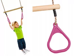 Drewniana huśtawka typu 'trapez' z obręczami gimnastycznymi Ruchliwość dzieci nie zna granic i dobrze zapewnić im odpowiednie możliwości wykonywania akrobacji. Drewniany trapez z trójkątnymi obręczami posiada szerokie zastosowanie w różnego rodzaju konstrukcjach i znakomicie rozwinie sprawność fizyczną Twojego dziecka. Z nami stworzysz najlepszy plac zabaw będący wspaniałym miejscem beztroskiej zabawy połączonej z aktywnością fizyczną. Dane techniczne: kolor: różowy liny PP o regulowanej długości do 130 cm wymiary drążka szer.