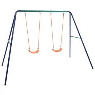 Huśtawka ta składa się z mocnej, stalowej ramy w kształcie litery A oraz 2 pojedynczych siedzeń. Dzięki wytrzymałej, stalowej ramie i plastikowym siedziskom zestaw ten jest niezwykle trwały i odporny na czynniki pogodowe. Siedzenia są solidnie przymocowane do wytrzymałej belki poprzecznej przy pomocy mocnych uchwytów, śrub, haków i lin.
