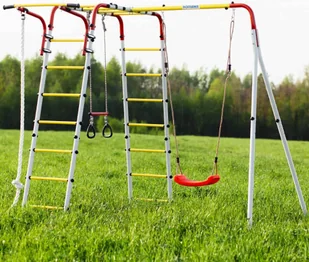 Tym samym plac zabaw będzie miejscem nie tylko wspaniałej zabawy, ale też zamieni się w znakomite miejsce do ćwiczeń. Wyposażenie placu zabaw do ogrodu: drabina metalowa - 2szt drążek do ćwiczeń z możliwością regulacji wysokości drabinka pozioma huśtawka do wyboru lina gimnastyczna kółka gimnastyczne z trapezem WAŻNE: Zestaw przeznaczony dla dzieci od 3 lat i dorosłych Dopuszczalne obciążenie: 100 kg (plac zabaw), 50 kg (akcesoria) Wysokość zestawu: