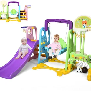 Ta urocza kombinacja zjeżdżalni i huśtawki 6 w 1 może zapewnić dzieciom nieograniczoną radość i nadaje się do wielu miejsc, takich jak ogród, taras, salon itp. Dzieci mogą grać w koszykówkę, piłkę nożną, huśtać się, wspinać się po drabinkach, zjeżdżać ze zjeżdżalni i malować, jednocześnie poprawiając swoje zdolności motoryczne. Solidne metalowe zawiasy i barierka zabezpieczająca przed upadkiem zapewniają bezpieczeństwo. Duża podstawa, którą można wypełnić wodą lub piaskiem, zapewnia stabilność. Ponadto niezawodny i nietoksyczny materiał HDPE zapewnia bezpieczeństwo i trwałość. Na co czekasz?