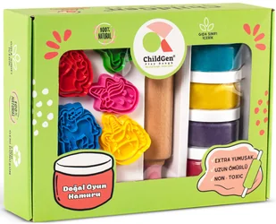 4 kolory ciastoliny (fioletowy, różowy, turkusowy i żółty) wykonanej z wyłącznie naturalnych składników,