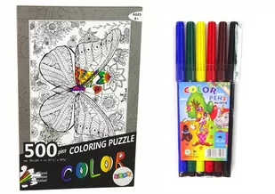 W zestawi znajdziemy 500 sztuk puzzli czarno- białych oraz 6 sztuk pisaków, którymi pomalujesz obrazek tak jak wyobraźnia podpowiada. Puzzle przedstawiają pięknego motyla w otoczeniu kwiatów. Obrazek można złożyć i wykorzystać jako dekorację na ścianie lub jako podkładka na biurku. Zestaw puzzli wykonany jest z wysokiej jakości przyjaznego dla środowiska kartonu. Rozmiar każdej układanki jest bardzo dokładny, precyzyjnie wycięty i nie jest szorstki oraz nie posiada ostrych zakończeń.