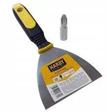 Szpachelka malarska z wkrętakiem 150mm Szpachelka malarska marki HARDY z wkrętakiem To praktyczny w zastosowaniu produkt umożliwiający wykonanie kilku różnorodnych zadań. Narzędzie o szerokim zastosowaniu dopasowane do wymogów profesjonalistów i majsterkowiczów wykonujących prace remontowo-budowlane. Zalety produktu: Uniwersalne zastosowanie: nakładanie mas, uzupełnianie ubytków, wygładzanie powierzchni, mieszanie substancji, skrobanie, zdzieranie, przykręcanie; Szpachelka wykonana ze stali nierdzewnej, która gwarantuje jej trwałość oraz żywotność; Ergonomiczna i antypoślizgowa rączka dwukomponentowa, gwarantuje wygodne użycie oraz dopasowuje się do dłoni; Wbudowany śrubokręt.