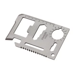 Metalowe narzędzie w kształcie karty. Pakowane w etui z ekoskóry. Ostrza wykonane ze stali nierdzewnej. Narzędzie zawiera: otwieracz do konserw, nóż, wkrętak płaski,miarkę, otwieracz do butelek, klucz oczkowy – 4 rozmiary, klucz do nakrętek motylkowych, piłę, kątomierz, klucz płaski – 2 rozmiary, remizę do troczenia/klucz do zaginania drutu.