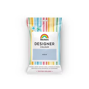 Beckers Tester koloru Designer Colour aqua 50 ml Emulsja marki Beckers z serii Designer Colour w kolorze aqua to wysokiej jakości, wodorozcieńczalna farba lateksowa. Przeznaczona jest do malowania ścian i sufitów. Wydziela nieznaczny zapach podczas aplikacji i schnięcia. Daje piękny efekt matowego wykończenia. Tworzy powłokę odporną na mycie wodą z dodatkiem detergentu.