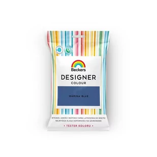 Beckers Tester koloru Designer Colour marina blue 50 ml Emulsja marki Beckers z serii Designer Colour w kolorze marina blue to wysokiej jakości, wodorozcieńczalna farba lateksowa. Przeznaczona jest do malowania ścian i sufitów. Wydziela nieznaczny zapach podczas aplikacji i schnięcia. Daje piękny efekt matowego wykończenia. Tworzy powłokę odporną na mycie wodą z dodatkiem detergentu.