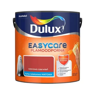 DULUX EASYCARE WZOROWA CZERWIEŃ 2,5L Farba DULUX z serii EASYCARE DULUX EASYCARE to pierwszy na rynku produkt, który wyróżniają wyjątkowe właściwości hydrofobowe. Dzięki specjalnej powłoce farba odpycha wodę oraz pozostałe płynne zabrudzenia, nie pozwalając tym samym na przeniknięcie w głąb powierzchni. DULUX EASYCARE to jedna z nielicznych farb plamoodpornych o matowym wykończeniu, zgodnie z obowiązującymi trendami. Powierzchnie zyskują perfekcyjnie matową powłokę, a niedoskonałości podłoża są niwelowane. Zalety farby DULUX z serii EASYCARE - 10x bardziej odporna na szorowanie niż standardowe farby - bezproblemowa aplikacja produktu - doskonałe krycie powierzchni - wysoka odporność na działanie czynników zewnętrznych.