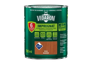 VIDARON Impr. P mahoń V24 0,7L Impregnat powłokotwórczy, przeznaczony do ochrony i dekoracji drewna, zarówno na zewnatrz jak i wewnątrz pomieszczeń. Skutecznie podkreśla naturalne piękno malowanego drewna, a jednocześnie impregnuje i chorni je przez niekorzystnymi warunkami atmosferycznymi. Na powierzchni drewna tworzy specjalną powłokę, które chroni przed jego biokorozją - siniznę, glony, grzyby pleśniowe, glony. W połączeniu z bezbarwnym Impregnatem Ochronnym VIDARON zapewnia pełną ochronę drewna.