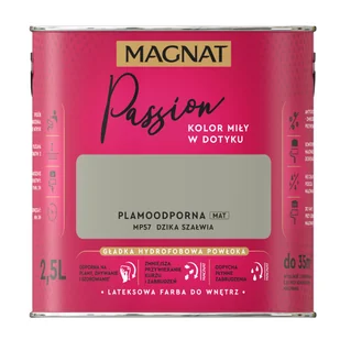 MAGNAT Passion to wysokiej jakości plamoodporna i hydrofobowa farba lateksowa. Gładka i matowa powłoka farby podkreśla głębię koloru i sprawia, że pomalowane ściany są wyjątkowo miłe w dotyku. Farba przeznaczona jest do dekoracyjnoochronnego malowania ścian i sufitów z zapraw cementowych, cementowowapiennych, gipsowych, cegły, płyt gipsowokartonowych, drewnianych, drewnopochodnych oraz tapet, również tych z włókna szklanego użytkowanych wewnątrz pomieszczeń. Nakładać za pomocą pędzla, wałka lub natrysku hydrodynamicznego Plamoodporna Gładka hydrofobowa powłoka: Odporna na plamy, zmywanie i szorowanie Zmniejsza przywieranie kurzu i zabrudzeń Odpycha płynne zabrudzenia Komfortowe malowanie.