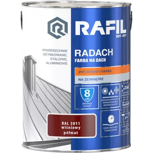 Radach wiśniowy RAL 3011 półmat 5l Wysokiej jakości gruntoemalia RADACH FARBA NA DACH przeznaczona jest do ochronno-dekoracyjnego malowania zewnętrznych powierzchni metalowych: stalowych, ocynkowanych i aluminiowych.
