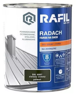 Radach zielony ciemny RAL 6007 półmat 0,75l Wysokiej jakości gruntoemalia RADACH FARBA NA DACH przeznaczona jest do ochronno-dekoracyjnego malowania zewnętrznych powierzchni metalowych: stalowych, ocynkowanych i aluminiowych.