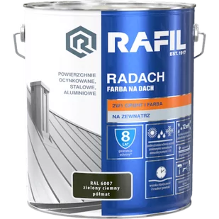 Radach zielony ciemny RAL 6007 półmat 10l Wysokiej jakości gruntoemalia RADACH FARBA NA DACH przeznaczona jest do ochronno-dekoracyjnego malowania zewnętrznych powierzchni metalowych: stalowych, ocynkowanych i aluminiowych.