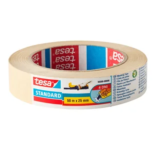 Tesa Taśma malarska Standard 50 m x 25 mm Taśma tesa Standard to uniwersalna taśma malarska, o której powinien pomyśleć każdy majsterkowicz w przypadku malowania ściany lub remontu domu. Użyj tej wszechstronnej taśmy malarskiej do skutecznego zabezpieczenia powierzchni niemal w każdej sytuacji. Jest dostępna w trzech szerokościach dostosowanych do wielu różnych zastosowań. Taśma posiada warstwę kleju bezrozpuszczalnikowego, dzięki czemu dobrze przywiera do większości powierzchni. Jednocześnie można ją łatwo usunąć bez pozostawiania śladów.