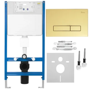 Uniwersalna konstrukcja – dzięki standardowym otworom montażowym stelaż pasuje zarówno do mis WC marki Rea, jak i ceramiki innych producentów. Rama ze stali nierdzewnej – wysokiej jakości stal zapewnia maksymalną wytrzymałość i odporność na korozję. Kompletny zestaw montażowy – stelaż jest wyposażony we wszystkie niezbędne elementy, w tym matę wygłuszającą, zestaw rur oraz komplet do zawieszenia misy WC. Przycisk Typ HD Złoty – do zestawu dołączony jest nowoczesny przycisk spłukujący w eleganckim, błyszczącym wykończeniu. Przycisk z trwałego tworzywa – wykonanie z wysokiej jakości tworzywa gwarantuje estetyczny wygląd i łatwość w utrzymaniu czystości.