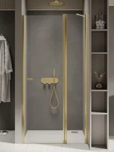 Drzwi prysznicowe new trendy new soleo 90x195 wnękowe złote uniwersalne d-0482a to elegancki i luksusowy produkt najwyższej jakości, który pięknie zaprezentuje się w każdej nowoczesnej łazience o kolorystyce zarówno jasnej, jak i ciemnej. Złote wykończenia rozświetlą strefę prysznicową i nadadzą jej stylowego charakteru. Jeśli chcesz, aby twoja łazienka wyglądała spójnie i estetycznie, warto skompletować drzwi ze złota armaturą łazienkową. Drzwi do kabiny wnękowej z dodatkową ścianką i wspornik