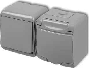 Łącznik jednobiegunowy z gniazdem hermetycznym (klapka popielata) IP 54, 10AX (łącznik) 16A (gniazdo) 250V~ wymiary: 126,9 x 70 x 50 mm