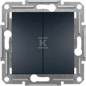 Łącznik podwójny schodowy w kolorze grafitowym, serii Asfora, marki Schneider Electric, o numerze katalogowym EPH0600371. Urządzenie może byc wykorzystywany jako tradycyjny włącznik światła lub służyć do załączania innych urządzeń o maksymalnym poborze prądu do 10 AX. P odłączenie przewodów za pomocą zacisków śrubowych. Długie i solidne pazury utrzymywane są za pomocą metalowych prowadnic w pozycji pionowej, co ułatwia montaż oraz zwiększa bezpieczeństwo podczas mocowania mechanizmu w puszce instalacyjnej. Mechanizm posiada czytelny sc hemat oraz oznaczenie zacisków ułatwiające podłączenie.