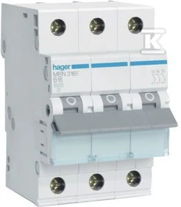 Wyłącznik nadmiarowo-prądowy, 6kA, charakterystyka B, 3-biegunowy, 16A o numerze katalogowym MBN316E w kategorii Wyłączniki nadprądowe 6kA, Wyłączniki nadprądowe. Produkt wyprodukowany przez markę HAGER.