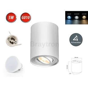 Reflektor sufitowy Braytron biały Szczegóły produktu1-płomienny Obrót o 45° GU10 5W 360 lumenów neutralna biel 4200K Materiał metal Stopień ochrony IP20 nadaje się tylko do użytku wewnątrz pomieszczeń 125 x 96 mm (wys. x głęb.)