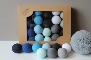 Zestawienie odważne i zdecydowane. Połączenie szarości, bieli z różnymi odcieniami niebieskiego. Zestaw składający się z kolorowych kulek i kabla przeznaczony jest do samodzielnego montażu. Do każdego zestawu dołączona jst instrukcja montażu. Każdy kabel w zestawie zawiera 5 sztuk zapasowych żarówek.