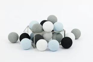 kule, żarówki, 5 zapasowych żarówek, kabel o odpowiedniej długości w stosunku do liczby kul, instrukcja montażu nadrukowana na pudełku. Ilość kul do wyboru: 10/20/35/50 sztuk Wymiary kul: Ø 6-7 cm. Materiał: przędza bawełniana Źródło światła: Żarówki wtykane o mocy: