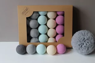 Doskonałe połączenie szarości z pastelowymi kolorami dającymi łagodne światło. Kule w zestawie to light magenta, shell, stone, mid grey oraz light aqua. Zestaw składający się z kolorowych kulek i kabla przeznaczony jest do samodzielnego montażu. Do każdego zestawu dołączona jest instrukcja montażu. Każdy kabel w zestawie zawiera 5 sztuk zapasowych żarówek.