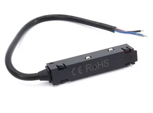Końcówka zasilająca z kablem do prowadnicy/szyny magnetycznej natynkowej i podtynkowej 1-fazowej do systemu firmy Syntron w kolorze czarnym. Element służący do podpięcia zasilania do systemu szynoprzewodów. Jeden koniec wpinamy w szynę a drugi podłączamy do zasilacza 48V DC.