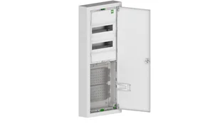 Rozdzielnica hybrydowa: RN 2x12M z zaciskami PE+N; multimedialna wyposażenie: płyta montażowa x2 + gniazdo 2P+Z 16A, IP30, drzwi metal, biały, MSF TWIN; 2015-20, EPN