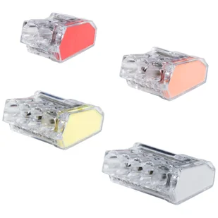 Złącza automatyczne, 2 wejścia, 3 wejścia, 4 wejścia, 5 wejść. Nowa seria złączy automatycznych LEXMAN, ultrakompaktowych, bezpiecznych i odpornych. Idealne do podłączania przewodów elektrycznych bez użycia narzędzi, na przykład w puszce przyłączeniowej. Ta seria złączy jest dostępna w wersjach 2, 3, 4 i 5 wejść, oznaczonych kolorami w celu łatwej identyfikacji (2 wejścia; różowe; 3 wejścia; pomarańczowe; 4 wejścia; żółte; 5 wejść; szare). Szybkie i bezpieczne wkładanie przewodów, bez ryzyka nieprawidłowego podłączenia dzięki punktowi testowemu.