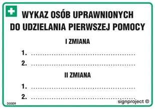 DD009 ZMIANOWY WYKAZ OSÓB UPRAWNIONYCH DO UDZIELANIA PIERWSZEJ POMOCY, PN - PŁYTA PCV 1MM; (148X105MM)