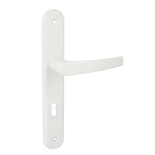 Klamka z szyldem Econom - biała, marki Domino. Jest to klamka w stylu uniwersalnym przeznaczona do mocowania w drzwiach wewnętrznych. Dzięki wysokiej jakości i precyzji wykonania, klamka doskonale się prezentuje podnosząc walory estetyczne każdych drzwi. Posiada szyld z otworem na klucz. Komplet zawiera:
