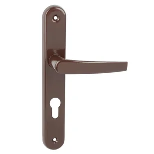 Klamka z szyldem Econom - brązowa, marki Domino. Jest to klamka w stylu uniwersalnym przeznaczona do mocowania w drzwiach wewnętrznych. Dzięki wysokiej jakości i precyzji wykonania, klamka doskonale się prezentuje podnosząc walory estetyczne każdych drzwi. Posiada szyld z otworem na wkładkę bębenkową. Komplet zawiera:
