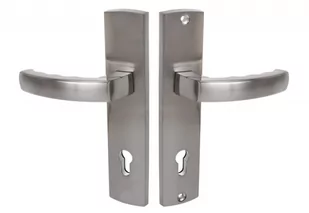 Klamka na podłużnym szyldzie, pokrytym niklem o wykończeniu satynowym. Idealna do drzwi zewnętrznych. Wysokość szyldu wynosi 234mm. Klamka posiada rozstaw 92mm. Polecamy! _x000D_