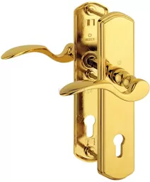 Komplet klamek ochronnych HOPPE Munchen ze stalową tarczą zabezpieczająca do drzwi zewnętrznych lub drzwi wejściowych mieszkania Rozstaw - od środka trzpienia klamki do środka okręgu otworu na klucz: 92 mm Grubość drzwi: 77-82 mm Kolor: złoty błyszczący F77 Powierzchnia: Resista (PVD) Typ produktu:
